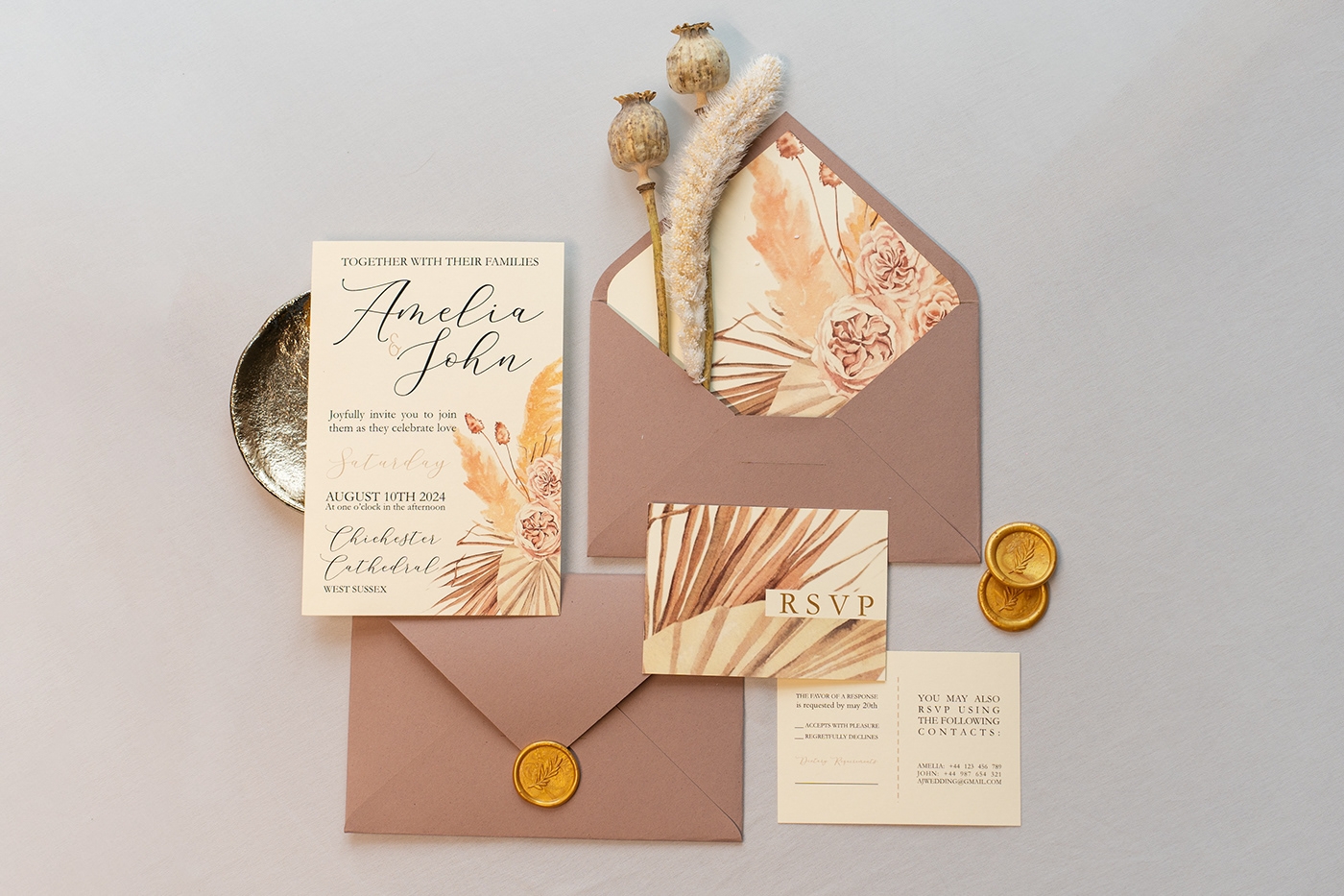 Tem havido um aumento na utilização da cor dourada e de flores na decoração de festas e na criação de convites, e, por isso, em 2025, a tendência para os convites de casamento centra-se bastante em estilos e designs florais, combinados com um toque dourado para conferir um toque mais elegante ao convite.
