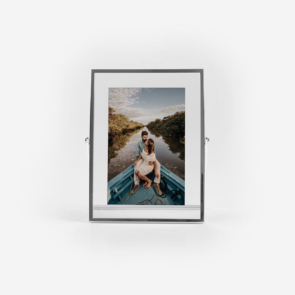 As molduras até 15x20 cm incluem suporte para colocação em mesa. A partir de 20x30 cm, são projetadas para serem penduradas na parede, tornando-se o destaque perfeito para qualquer ambiente.